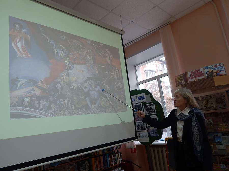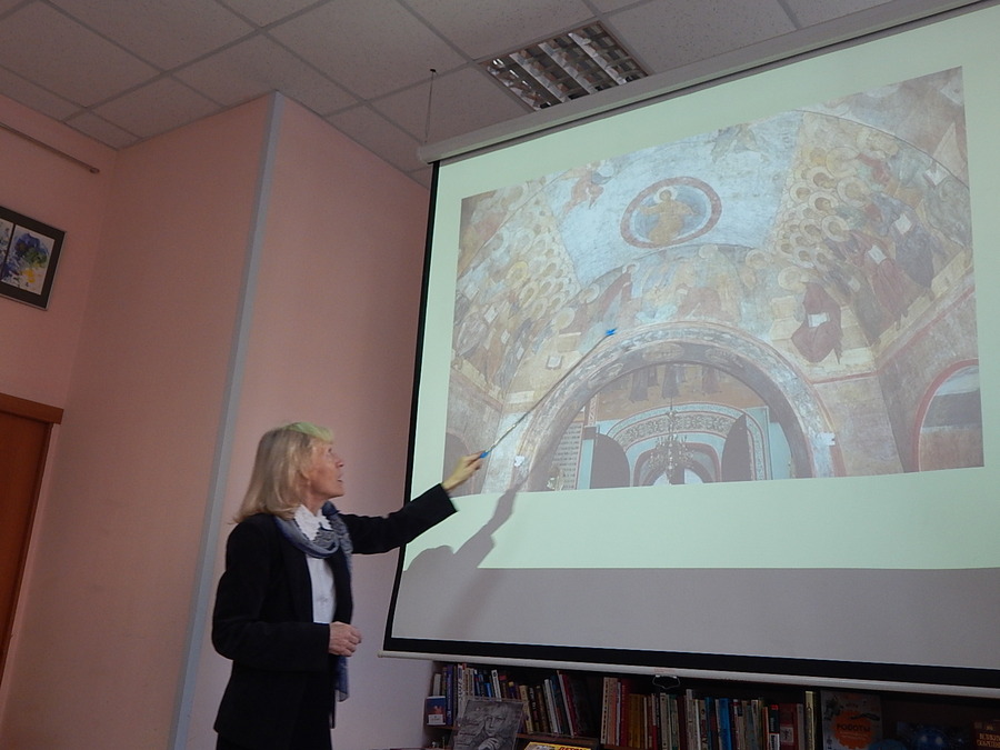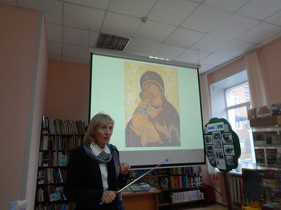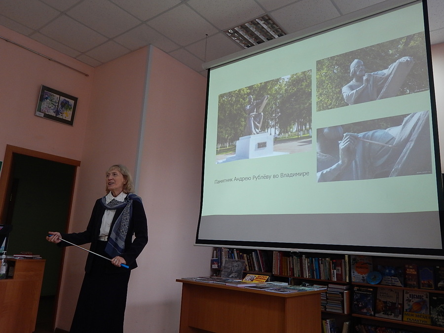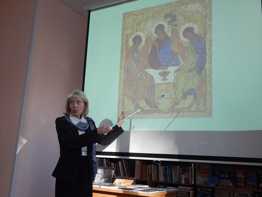 Очередное заседание в рамках проекта "Историко-литературный салон "Угостите историей" провела научный сотрудник Тульской Духовной Семинарии М.А. Михалёва. Оно было посвящено жизни и творчеству одного из самых известных русских иконописцев Андрею Рублёву, канонизированного в 1988 году. Марина Александровна познакомила с предполагаемыми событиями его жизни, остановилась на творчестве Андрея Рублева, показала и детально разобрала фрески его авторства, сохранившиеся на территории Успенского собора г. Владимира. Привлекла внимание присутствующих к иконе Святой Троицы - самой известной и таинственной в его творчестве.