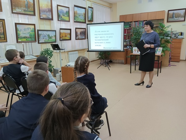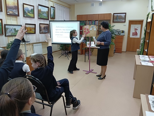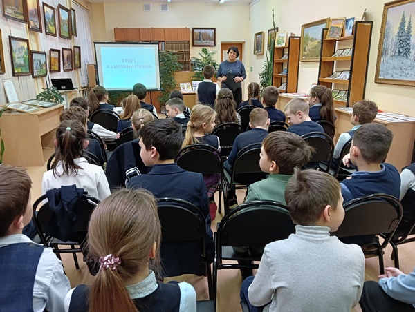 Перед просмотром фильма школьники постарались сформулировать своё понимание взаимопомощи, придя к единому выводу о важности совместной деятельности в коллективе. Затем состоялся просмотр короткометражного фильма "Волшебники", который помог детям осознать истину – человек должен быть там, где нужна его помощь. Творить волшебство – это проявлять доброту и отзывчивость, и эти волшебные силы нужно использовать во благо окружающих. Для закрепления полученных знаний ведущая провела интерактивную игру "Да-нет" с вопросами о взаимовыручке. Школьники познакомились с библиотечной выставкой "Помогайте друг другу".