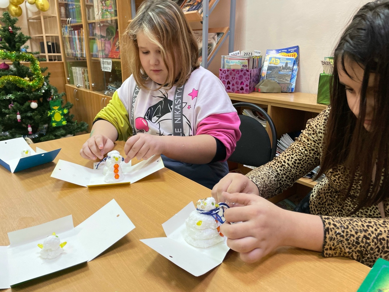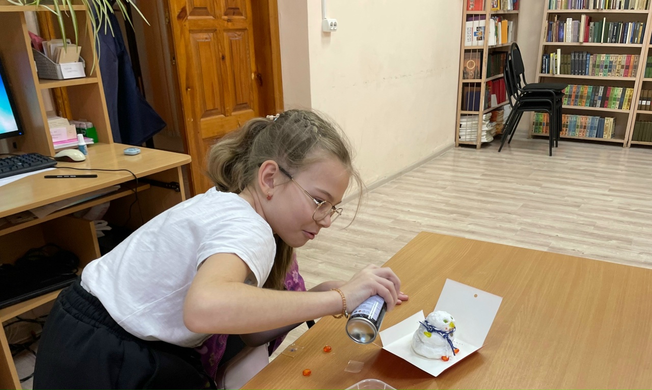 Мероприятие началось с знакомства с техникой папье-маше. Сначала ребятам рассказали о технике папье‑маше, её истории и особенностях. Затем вместе приготовили необходимую смесь: измельчили бумагу, добавили клей и воду, тщательно перемешали до однородной консистенции. После теоретической части перешли к практике: сотрудник библиотеки продемонстрировал, как из полученной массы лепить основные элементы снеговика. Дети с энтузиазмом принялись за работу — формировали шарики разного размера, соединяли их между собой, придавали фигурам нужную форму. На завершающем этапе ребята декорировали своих снеговиков: использовали краски, блёстки и другие материалы для украшения. В итоге каждый участник ушёл домой с уникальной новогодней поделкой, созданной собственными руками.