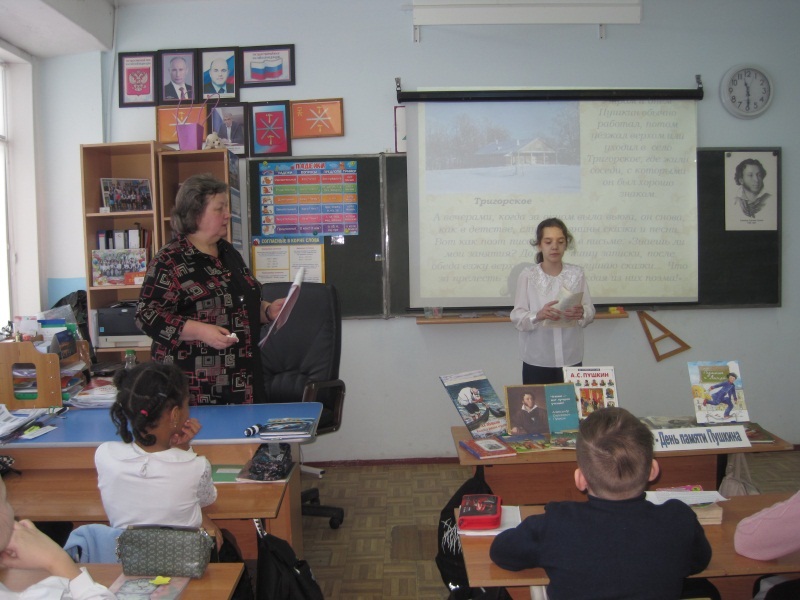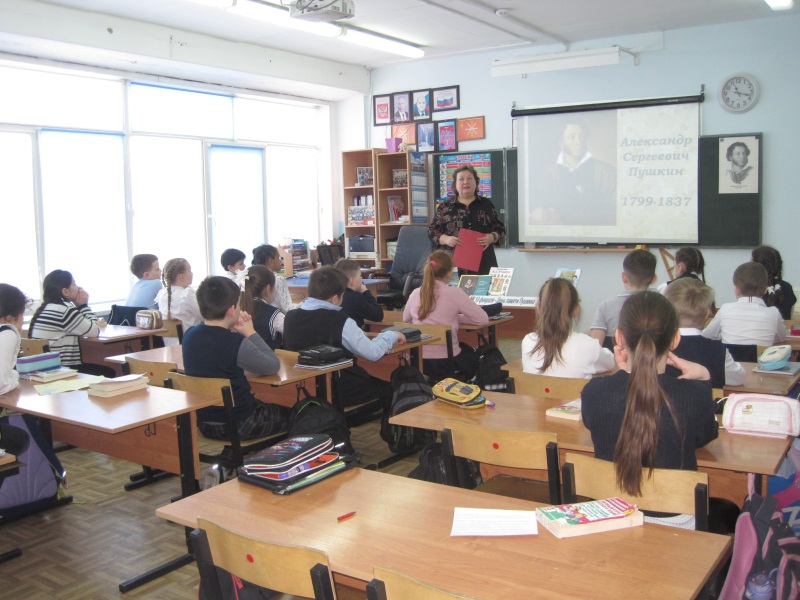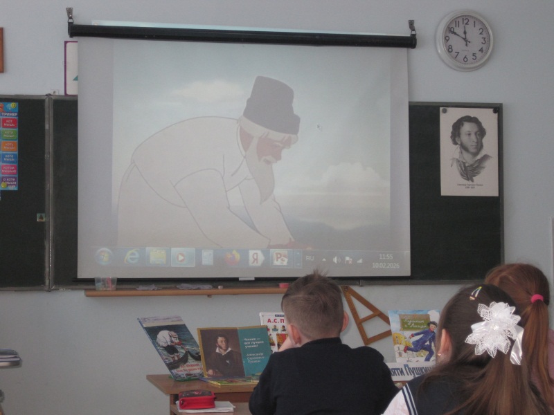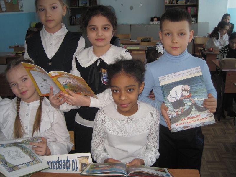 Каждый русский человек от мала до велика знает, что Пушкин это «Солнце русской поэзии» и «Наше всё»! Имя этого поэта мы слышим ещё в детстве, и учим наизусть его стихи не по принуждению, а просто для души. Ребята послушали рассказ библиотекаря о жизни поэта, читали стихи, слушали отрывок из «Сказки о рыбаке и рыбке» в исполнении ученицы, посмотрели мультфильм и восхищались богатством и благозвучием родного языка, который открыл для них А.С. Пушкин.