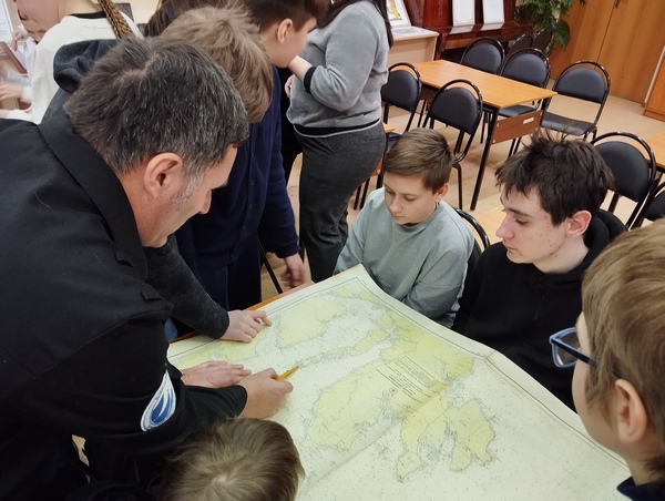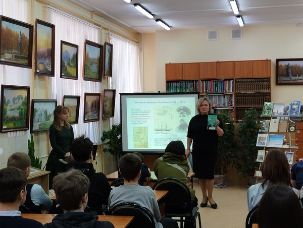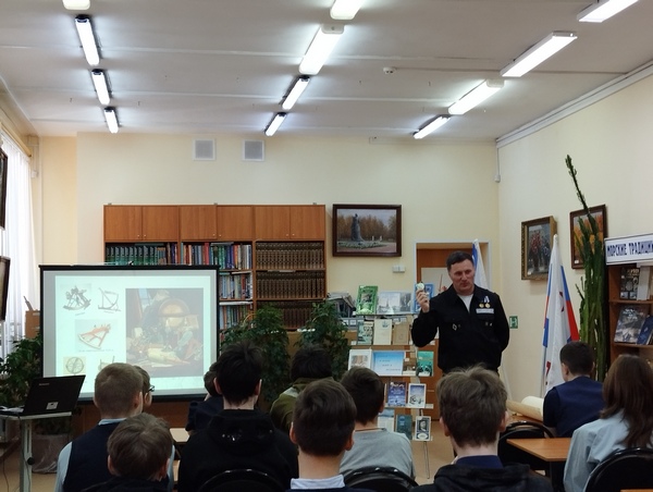 Исторический час начался с рассказа о развитии морского дела в России, о начале централизованной штурманской службы. С помощью видеопрезентации ребята узнали о географических открытиях, совершённых русскими моряками, а также о нашем земляке – выдающемся флотском штурмане С. И. Челюскине. Затем перед собравшимися выступил гость – член Русского географического общества (Тульское отделение), руководитель объединения "Корабелы" А. М. Макарцов. В практической части он научил ребят работать с картами и прокладывать маршруты. В завершении мероприятия каждый желающий мог задать Андрею Михайловичу интересующие вопросы. На библиотечной выставке была представлена литература о мастерах навигацкого дела, в том числе книга "Два Капитана", прототипом персонажа, которой стал знаменитый путешественник и первооткрыватель Альбанов Валериан Иванович.