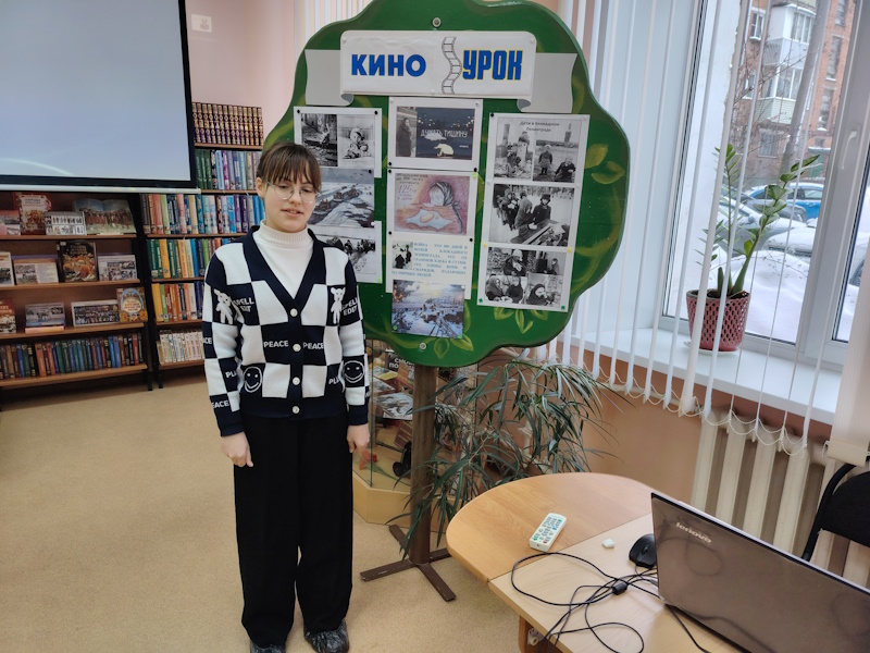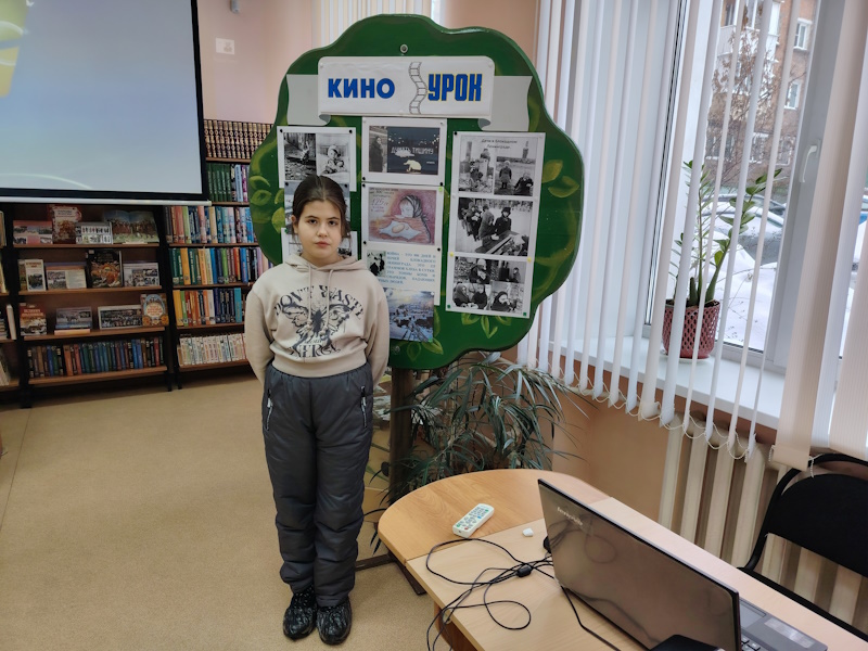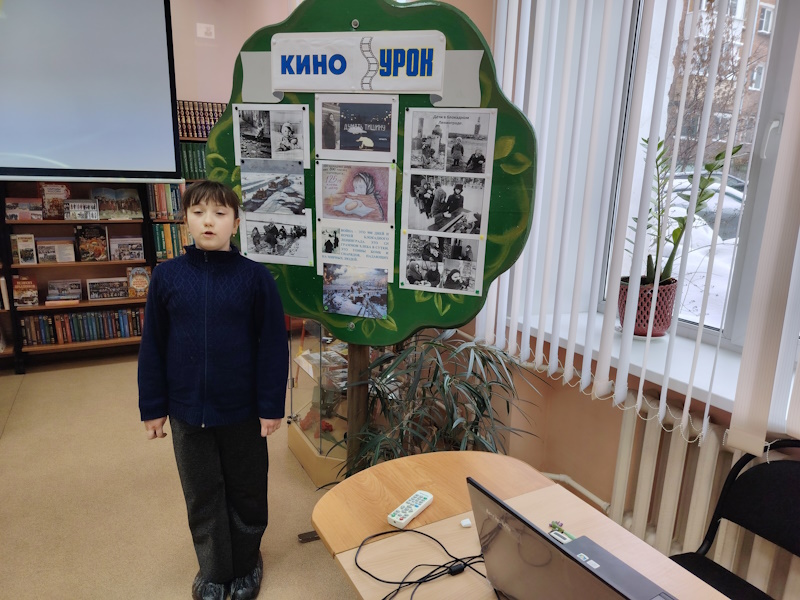 В рамках проекта «Киноуроки в школах России» состоялся показ фильма «Думать тишину», основанный на реальных событиях, который переносит юного зрителя в суровые дни блокады Ленинграда. Фильм затронул души детей, вызвав глубокие переживания и яркие эмоции. Особенно их поразило, когда библиотекарь показала кусочек хлеба в 125 грамм, который выдавался на день жителям осаждённого города. Ребята делились своими впечатлениями, осознавая важность таких качеств, как чуткость, человечность, взаимопомощь, которые даже в страшные годы блокады проявляли маленькие жители Ленинграда, и никакие вражеские обстрелы, ни голод, ни холод не могли разрушить в людях милосердие и сострадание. Участники пришли к выводу, что и сегодня необходимо совершать добрые дела и помогать окружающим. В конце урока библиотекарь провела обзор книг о детях блокадного Ленинграда, представленных на выставке «Детям войны посвящается»