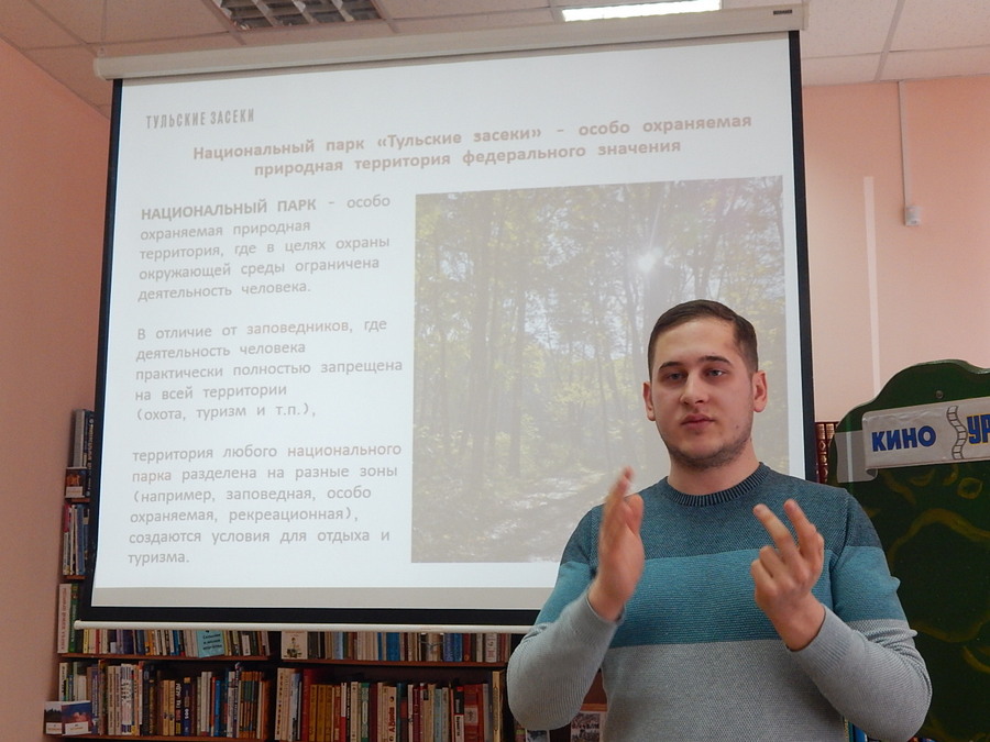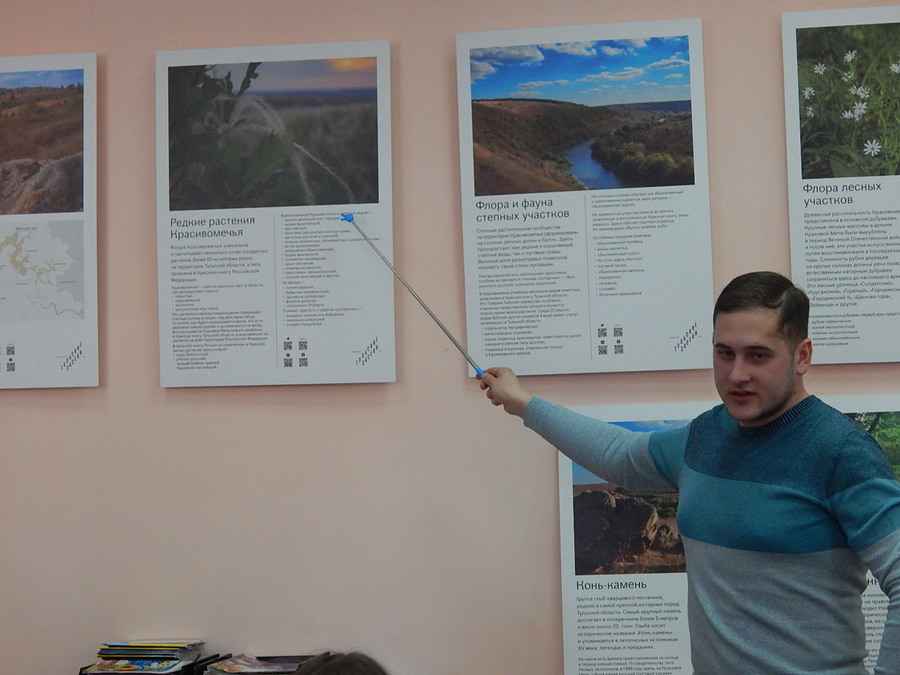 Специалист по развитию туризма нацпарка "Тульские засеки" Гороховиков Владислав Вадимович познакомил ребят с особо охраняемой природной территорией Тульской области, имеющей федеральное значение, обозначил её месторасположение, рассказал о задачах и направлении деятельности. Участники мероприятия узнали о "Красивомечье", расположенном недалеко от г. Ефремова. Лесные и степные участки долины реки Красивая Меча отличаются богатым разнообразием видов флоры и фауны, около 200 видов занесены в региональную, а 5 видов растений — в федеральную Красные книги. Ребята познакомились с яркими достопримечательностями территории - ведьминой горой, каменной дорогой и конём-камнем. И все захотелось посмотреть воочию место, которое называют тульской Швейцарией.