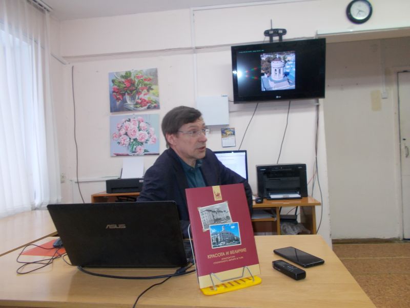 Автор книги - писатель, краевед, филокартист Владимир Щербаков. Книга вышла в издательстве "Борус-Принт" в серии "Тула ушедшего века", редактор - Наталия Кириленко, верстка и дизайн - Дмитрий Кузнецов. Под книжной обложкой - систематизированная информация об архитектуре так называемого сталинского ампира в Туле. Как сказал автор, книга была задумана не как справочник, а как путеводитель. Главные "герои" книги - здания, расположенные на проспекте Ленина и в его окрестностях. Владимир Щербаков провел с нами виртуальную экскурсию - от "ампирного" перекрестка улицы Первомайской и пр. Ленина вниз и вверх по проспекту, рассказал об архитектурных особенностях жилых и административных зданий, о том, как они строились и об известных людях - их жильцах. Книга написана с любовью, с ярко выраженным авторским отношением к теме. В конце встречи автор ответил на многочисленные вопросы, состоялась фото- и автограф-сессия. Экземпляр книги подписан автором читателям библиотеки № 6.