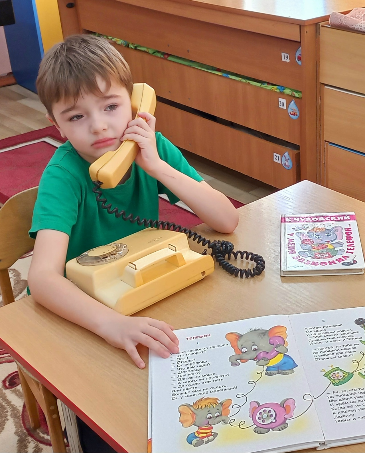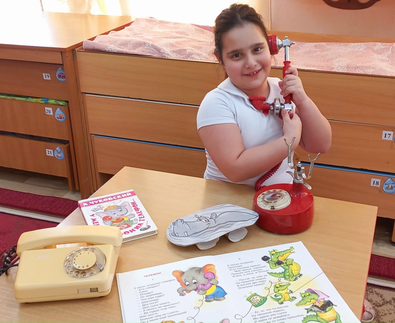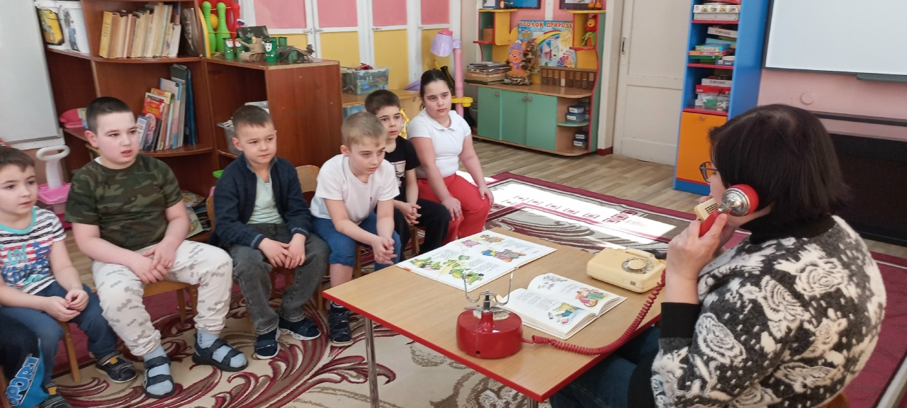 Пришедшая в гости к дошколятам библиотекарь, "вооружившись" двумя телефонами прочитала замечательное стихотворение Корнея Чуковского "У меня зазвонил телефон", которое отмечает в этом году свой 100 - летний юбилей. Ребята внимательно и с интересом слушали, а затем отвечали на вопросы : как общался Корней Чуковский с разными животными, как менялось его настроение. Попробовали себя в роли "спасателей"- тащили из болота бегемота. Выразительная, яркая сказка в стихах К. И. Чуковского завораживают ребенка, ведь он в своих сказках играет с малышами, и для маленьких слушателей чтение этих сказок превращается в забавную игру.